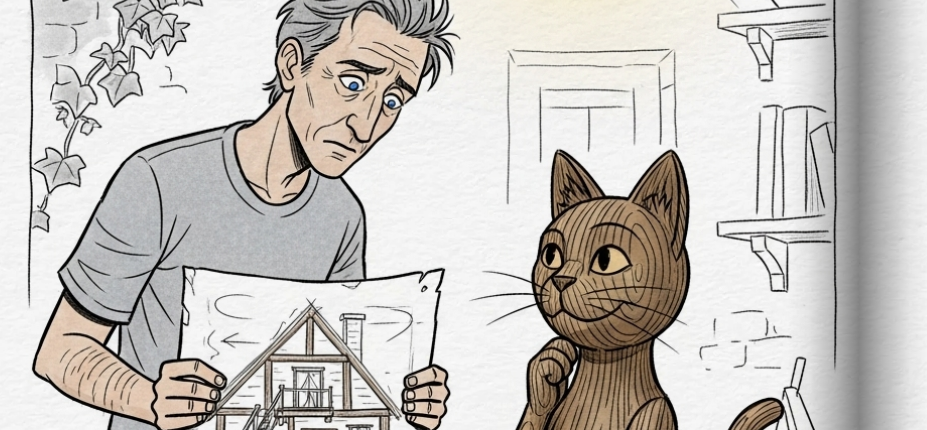 Eines Tages betrat ein Herr mit einem Stapel unordentlicher Skizzen die Werkstatt. „Herr HolzKater,“ sagte er verzweifelt, „ich habe diesen unmöglichen Dachboden. Nichts passt! Man sagt, nur Sie können mir helfen.“ Sam schnurrte leise und nahm die Herausforderung an.