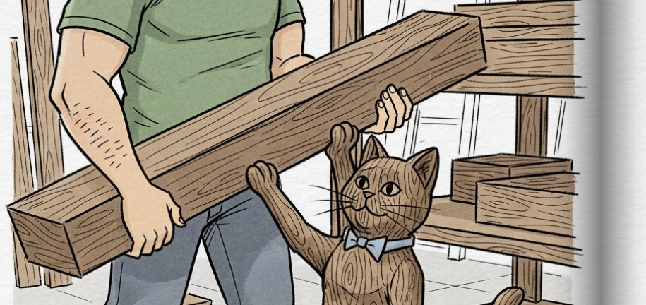 Das Regal war groß und die Holzbalken schwer. „Hans!“, rief Sam. „Ich brauche deine starken Arme!“ Sofort war sein Helfer zur Stelle, ein Bär von einem Mann mit einem Herzen aus Gold.